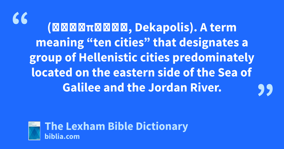 Decapolis (Δεκάπολις, Dekapolis). A term meaning “ten cities” that designates a group of Hellenistic cities predominately located on the eastern side of the Sea of Galilee and the Jordan River.