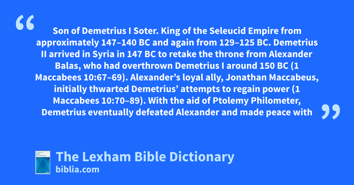 Demetrius II Nicator Son of Demetrius I Soter. King of the Seleucid Empire from approximately 147–140 bc and again from 129–125 bc. Demetrius II arrived in Syria in 147 bc to retake the throne from Alexander Balas, who had overthrown Demetrius I around 150 bc (1 Maccabees 10:67–69). Alexander’s loyal ally, Jonathan Maccabeus, initially thwarted Demetrius’ attempts to regain power (1 Maccabees 10:70–89). With the aid of Ptolemy Philometer, Demetrius eventually defeated Alexander and made peace with Jonathan (1 Maccabees 11:1–37). The peace did not last since Demetrius did not keep his promises to the Jews (1 Maccabees 11:52–53). Jonathan allied with Trypho against Demetrius (1 Maccabees 11:54–57), but when Trypho betrayed and murdered Jonathan (1 Maccabees 12:39–53), Simon, Jonathan’s brother and the new leader of the Jews (1 Maccabees 13:1–11), joined forces with Demetrius to defeat Trypho (1 Maccabees 13:31–42). Around 140 bc, Demetrius entered Parthia to seek their help against Trypho, but he was imprisoned by Arsaces (1 Maccabees 14:1–3). While Demetrius was imprisoned in Parthia, his brother Antiochus Sidetes was the Seleucid king. According to Josephus, Arsaces released Demetrius when Antiochus invaded Parthia (Antiquities 13.253). The Parthians defeated Antiochus, who died in battle, so Demetrius regained the throne. He later died after a battle with the army of Ptolemy Physcon (Josephus, Antiquities 13.267–68).