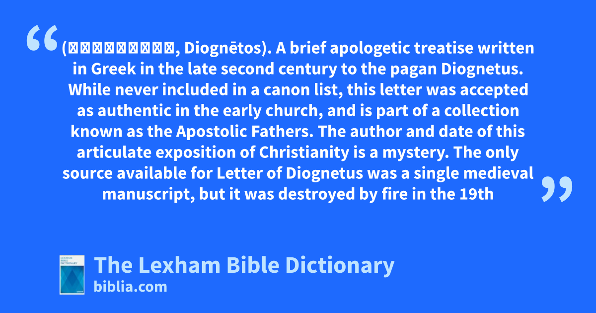 Diognetus, Letter To (Διόγνητος, Diognētos). A brief apologetic treatise written in Greek in the late second century to the pagan Diognetus. While never included in a canon list, this letter was accepted as authentic in the early church, and is part of a collection known as the Apostolic Fathers. The author and date of this articulate exposition of Christianity is a mystery. The only source available for Letter of Diognetus was a single medieval manuscript, but it was destroyed by fire in the 19th century; today, reconstructions are based upon transcriptions which disagree at times. The Letter of Diognetus provides moral comment on the foolishness of idolatry and on Christian character and behavior in the world.