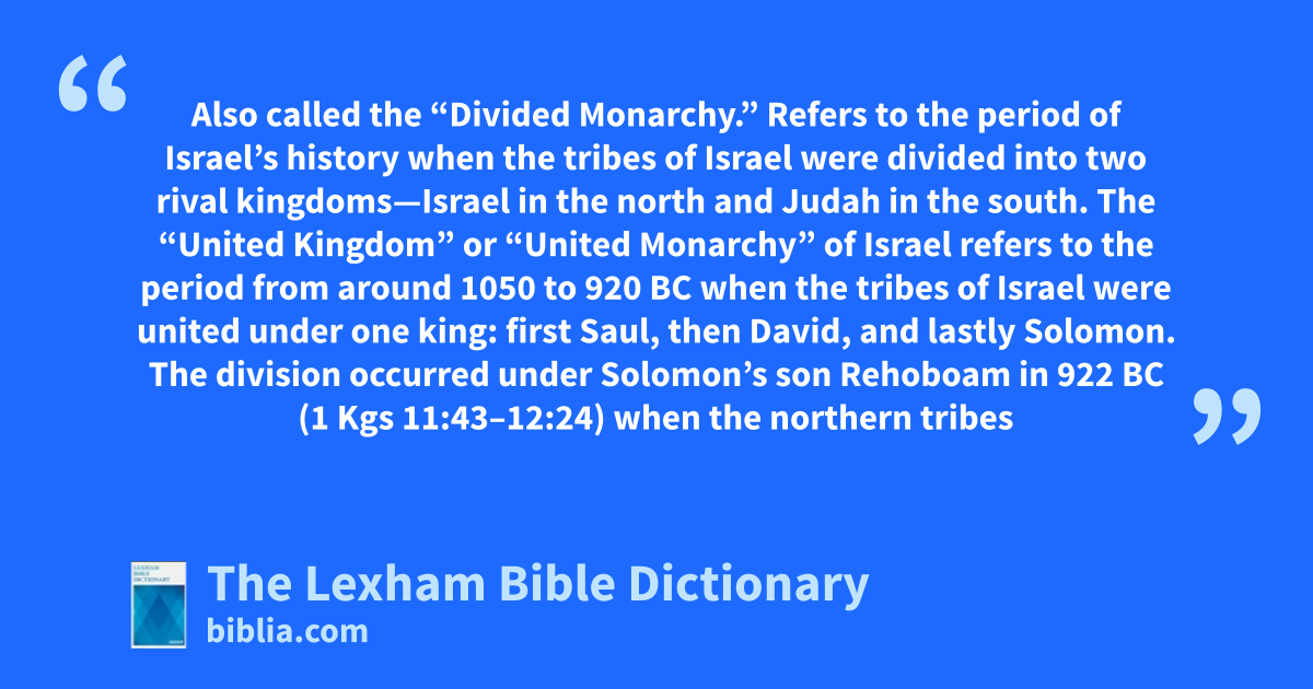 Divided Kingdom Also called the “Divided Monarchy.” Refers to the period of Israel’s history when the tribes of Israel were divided into two rival kingdoms—Israel in the north and Judah in the south. The “United Kingdom” or “United Monarchy” of Israel refers to the period from around 1050 to 920 bc when the tribes of Israel were united under one king: first Saul, then David, and lastly Solomon. The division occurred under Solomon’s son Rehoboam in 922 bc (1 Kgs 11:43–12:24) when the northern tribes seceded under the leadership of Jeroboam, son of Nebat. Jeroboam was the first king of the northern kingdom of Israel; he reigned until 901 bc. Ahab’s father, Omri, established Samaria as the new capital city of Israel in the early 9th century bc (1 Kgs 16:20–28). The separate kingdoms existed until the fall of Samaria in 722/721 bc (2 Kgs 17:1–18).