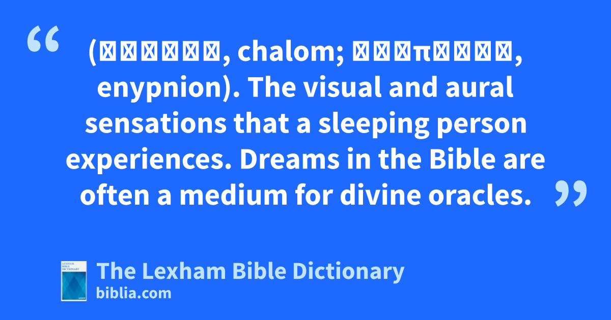 Dream (חֲלוֹם, chalom; ἐνύπνιον, enypnion). The visual and aural sensations that a sleeping person experiences. Dreams in the Bible are often a medium for divine oracles.