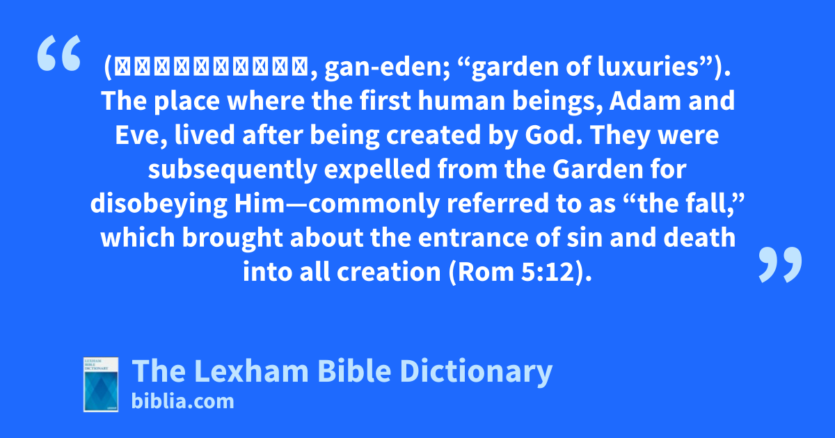 Eden, Garden Of (גַּן־עֵדֶן, gan-eden; “garden of luxuries”). The place where the first human beings, Adam and Eve, lived after being created by God. They were subsequently expelled from the Garden for disobeying Him—commonly referred to as “the fall,” which brought about the entrance of sin and death into all creation (Rom 5:12).