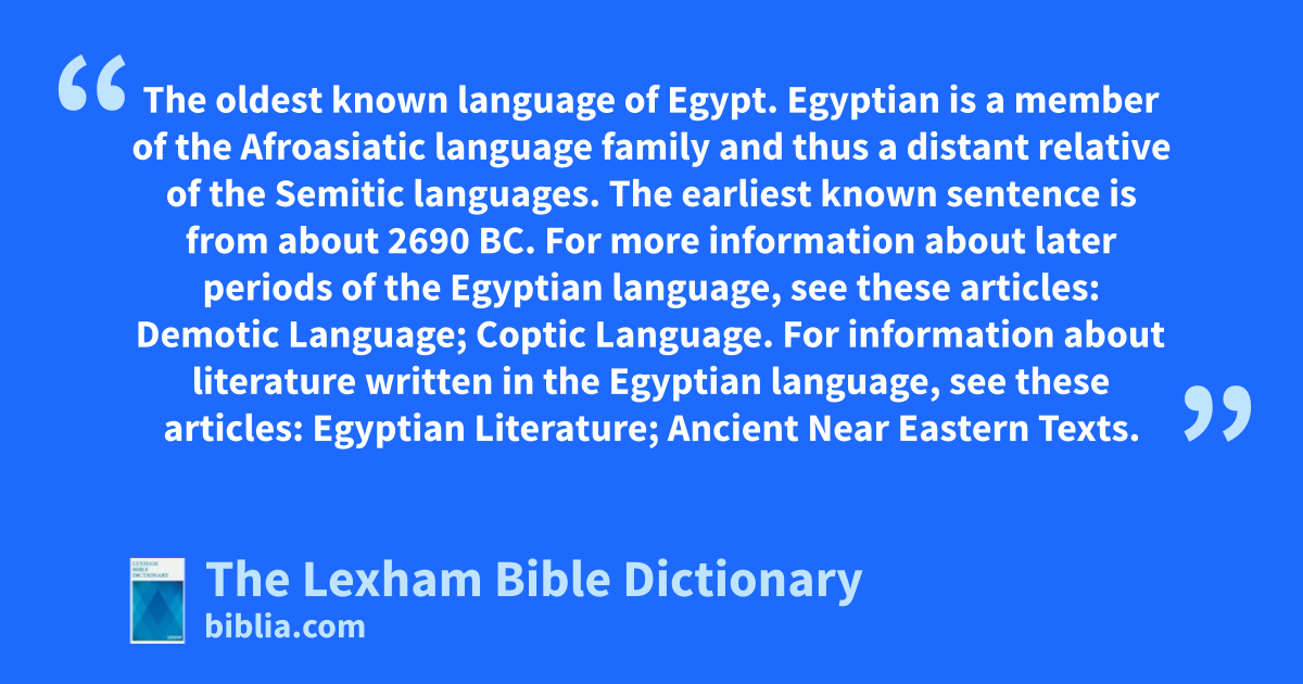 Egyptian Language The oldest known language of Egypt. Egyptian is a member of the Afroasiatic language family and thus a distant relative of the Semitic languages. The earliest known sentence is from about 2690 bc. For more information about later periods of the Egyptian language, see these articles: Demotic Language; Coptic Language. For information about literature written in the Egyptian language, see these articles: Egyptian Literature; Ancient Near Eastern Texts.