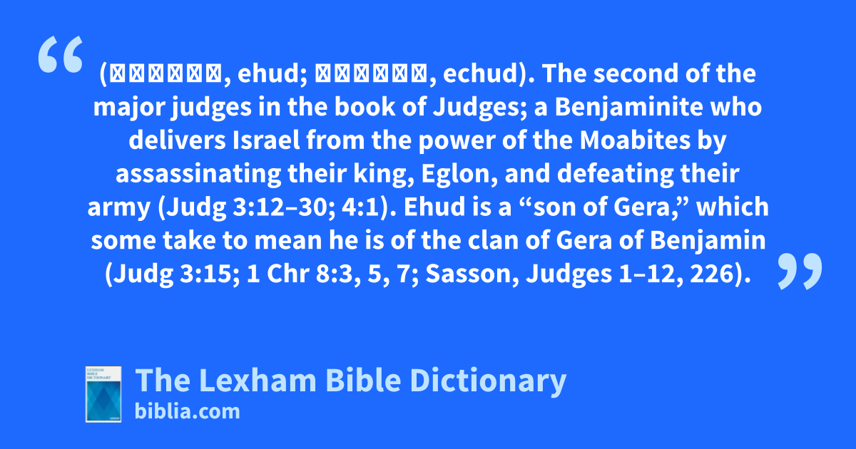 Ehud the Judge (אֵהוּד, ehud; אֵחוּד, echud). The second of the major judges in the book of Judges; a Benjaminite who delivers Israel from the power of the Moabites by assassinating their king, Eglon, and defeating their army (Judg 3:12–30; 4:1). Ehud is a “son of Gera,” which some take to mean he is of the clan of Gera of Benjamin (Judg 3:15; 1 Chr 8:3, 5, 7; Sasson, Judges 1–12, 226).