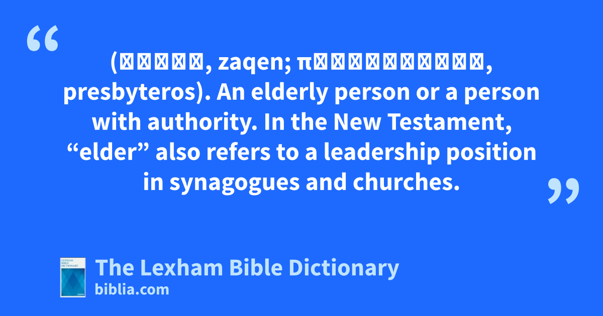 Elder (זָקֵן, zaqen; πρεσβύτερος, presbyteros). An elderly person or a person with authority. In the New Testament, “elder” also refers to a leadership position in synagogues and churches.