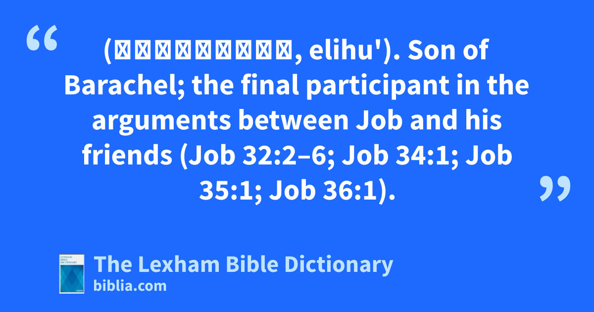 Elihu the Buzite (אֱלִיהוּא, elihu'). Son of Barachel; the final participant in the arguments between Job and his friends (Job 32:2–6; Job 34:1; Job 35:1; Job 36:1).