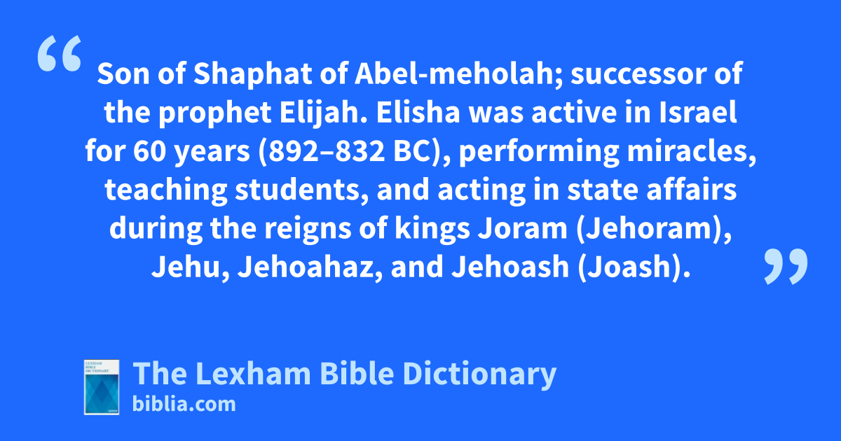 Elisha the Prophet Son of Shaphat of Abel-meholah; successor of the prophet Elijah. Elisha was active in Israel for 60 years (892–832 bc), performing miracles, teaching students, and acting in state affairs during the reigns of kings Joram (Jehoram), Jehu, Jehoahaz, and Jehoash (Joash).