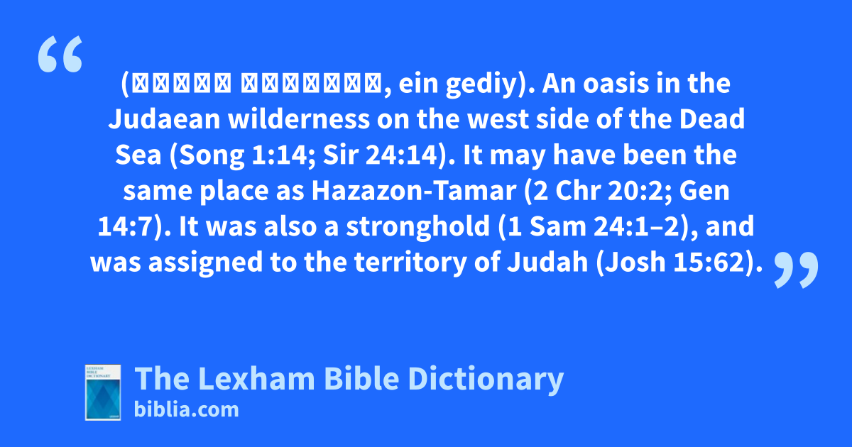 En-Gedi (עֵ֥ין גֶּֽדִי, ein gediy). An oasis in the Judaean wilderness on the west side of the Dead Sea (Song 1:14; Sir 24:14). It may have been the same place as Hazazon-Tamar (2 Chr 20:2; Gen 14:7). It was also a stronghold (1 Sam 24:1–2), and was assigned to the territory of Judah (Josh 15:62).