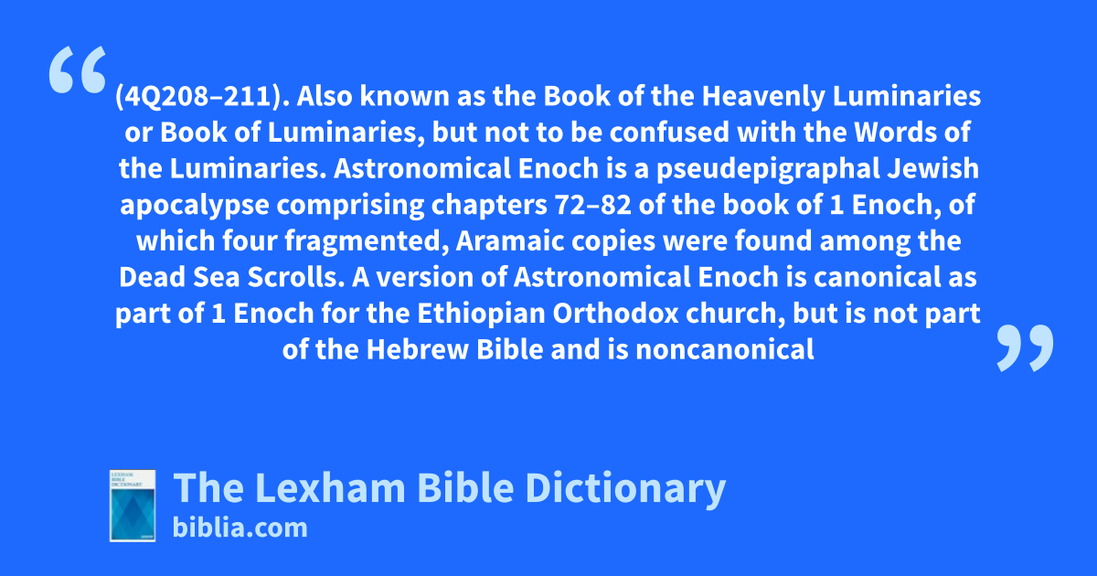 Enoch, Astronomical (4Q208–211). Also known as the Book of the Heavenly Luminaries or Book of Luminaries, but not to be confused with the Words of the Luminaries. Astronomical Enoch is a pseudepigraphal Jewish apocalypse comprising chapters 72–82 of the book of 1 Enoch, of which four fragmented, Aramaic copies were found among the Dead Sea Scrolls. A version of Astronomical Enoch is canonical as part of 1 Enoch for the Ethiopian Orthodox church, but is not part of the Hebrew Bible and is noncanonical for all other Christian traditions.