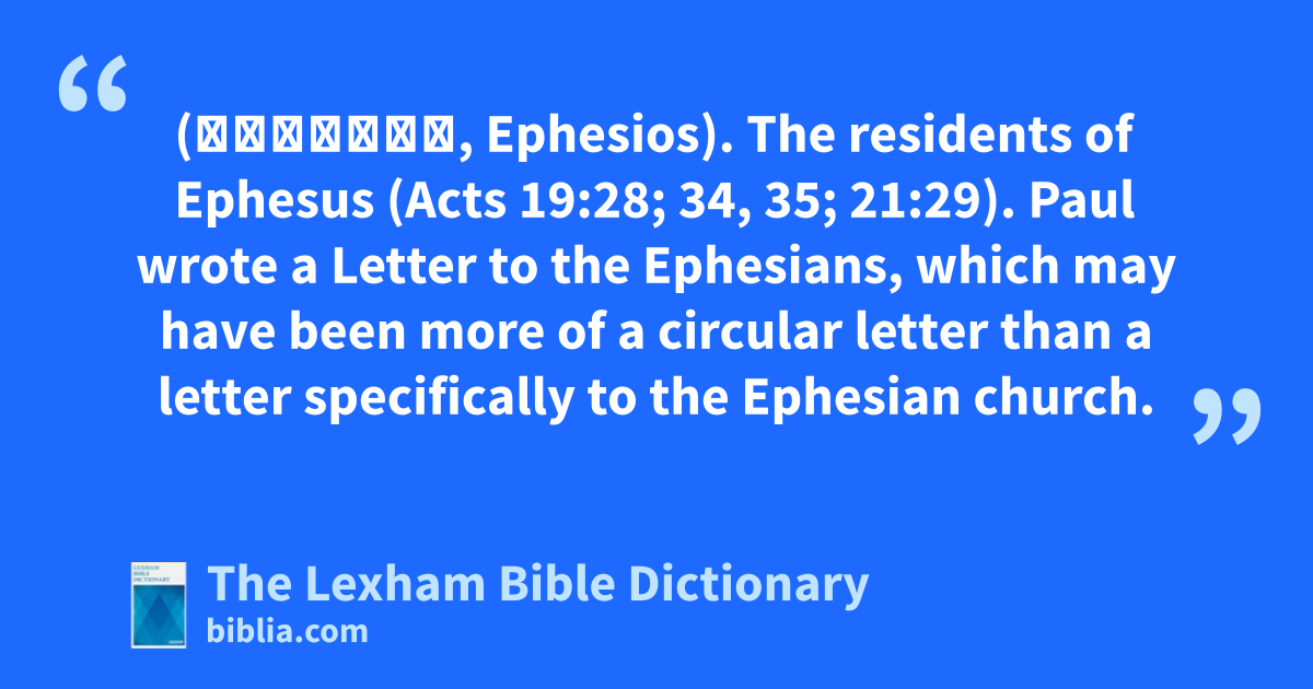Ephesians (Ἐφέσιος, Ephesios). The residents of Ephesus (Acts 19:28; 34, 35; 21:29). Paul wrote a Letter to the Ephesians, which may have been more of a circular letter than a letter specifically to the Ephesian church.