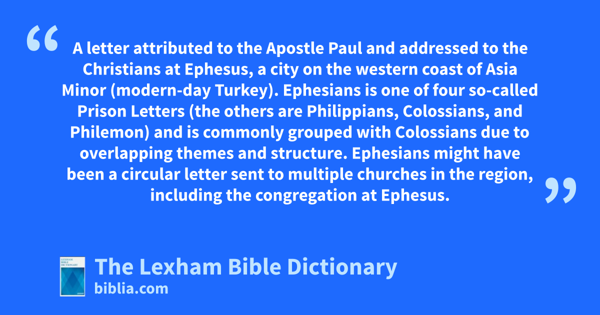 Ephesians, Letter to The A letter attributed to the Apostle Paul and addressed to the Christians at Ephesus, a city on the western coast of Asia Minor (modern-day Turkey). Ephesians is one of four so-called Prison Letters (the others are Philippians, Colossians, and Philemon) and is commonly grouped with Colossians due to overlapping themes and structure. Ephesians might have been a circular letter sent to multiple churches in the region, including the congregation at Ephesus.