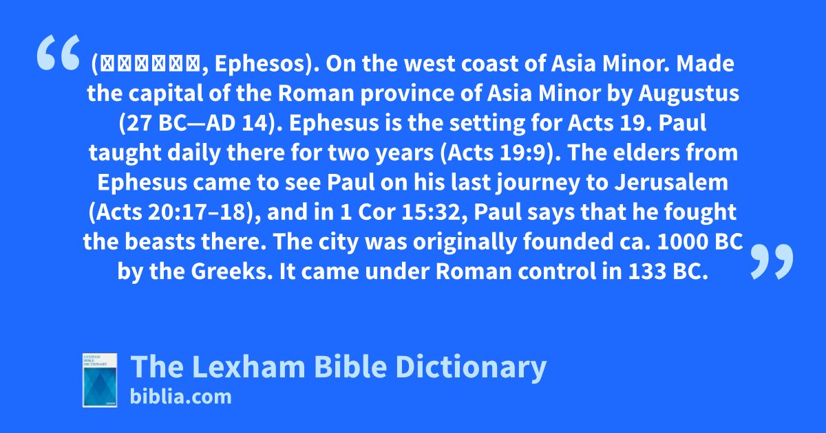 Ephesus (Ἔφεσος, Ephesos). On the west coast of Asia Minor. Made the capital of the Roman province of Asia Minor by Augustus (27 bc—ad 14). Ephesus is the setting for Acts 19. Paul taught daily there for two years (Acts 19:9). The elders from Ephesus came to see Paul on his last journey to Jerusalem (Acts 20:17–18), and in 1 Cor 15:32, Paul says that he fought the beasts there. The city was originally founded ca. 1000 bc by the Greeks. It came under Roman control in 133 bc.