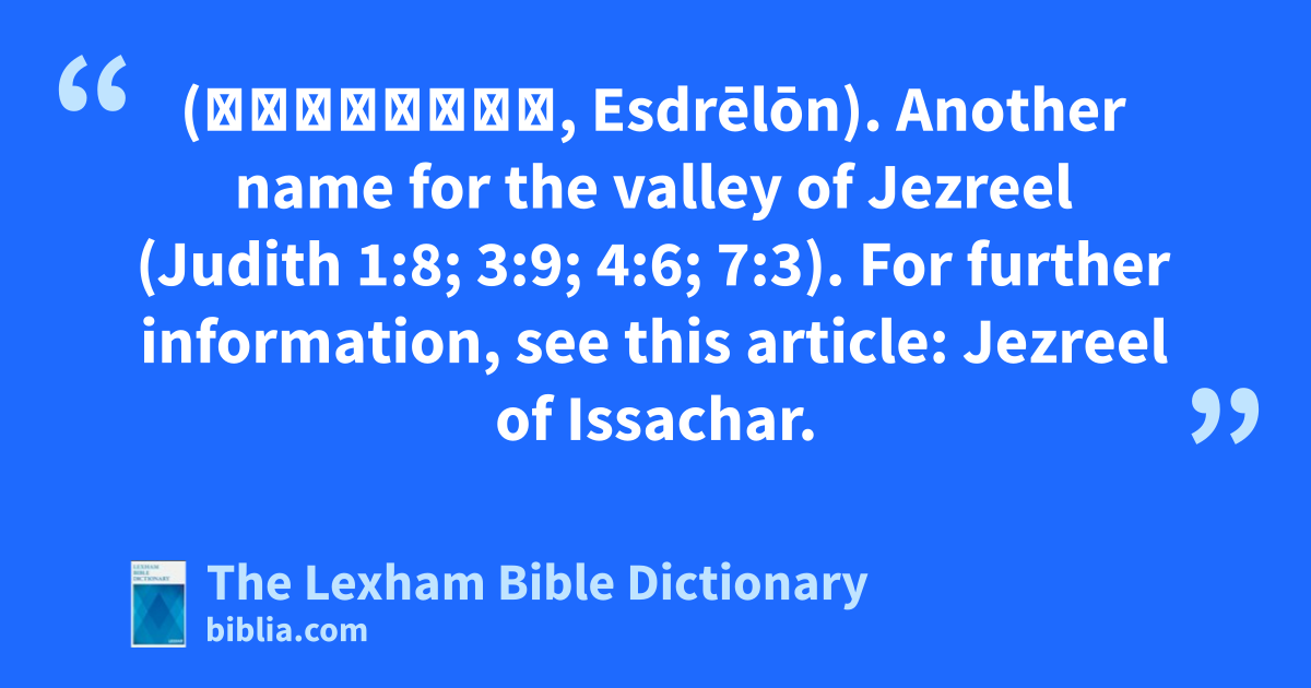 Esdraelon (Ἐσδρηλων, Esdrēlōn). Another name for the valley of Jezreel (Judith 1:8; 3:9; 4:6; 7:3). For further information, see this article: Jezreel of Issachar.