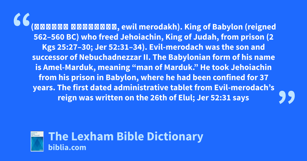 Evil-merodach was the son and successor of Nebuchadnezzar II. The Babylonian form of his name is Amel-Marduk, meaning “man of Marduk.” He took Jehoiachin from his prison in Babylon, where he had been confined for 37 years. The first dated administrative tablet from Evil-merodach’s reign was written on the 26th of Elul; Jer 52:31 says that Jehoiachin was freed from prison on the 25th of the same month.