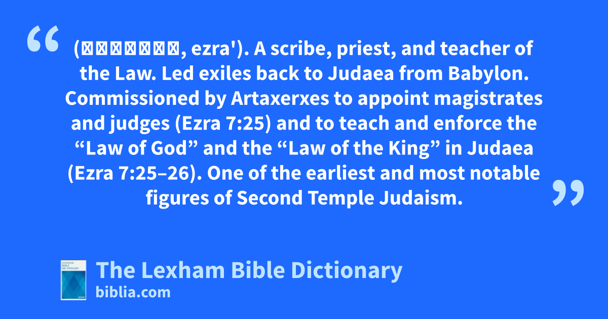 Ezra, Leader of the Exiles, Son of Seraiah (עֶזְרָא, ezra'). A scribe, priest, and teacher of the Law. Led exiles back to Judaea from Babylon. Commissioned by Artaxerxes to appoint magistrates and judges (Ezra 7:25) and to teach and enforce the “Law of God” and the “Law of the King” in Judaea (Ezra 7:25–26). One of the earliest and most notable figures of Second Temple Judaism.