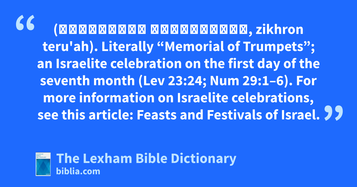 Trumpets, Feast Of (זִכְר֥וֹן תְּרוּעָ֥ה, zikhron teru'ah). Literally “Memorial of Trumpets”; an Israelite celebration on the first day of the seventh month (Lev 23:24; Num 29:1–6). For more information on Israelite celebrations, see this article: Feasts and Festivals of Israel.