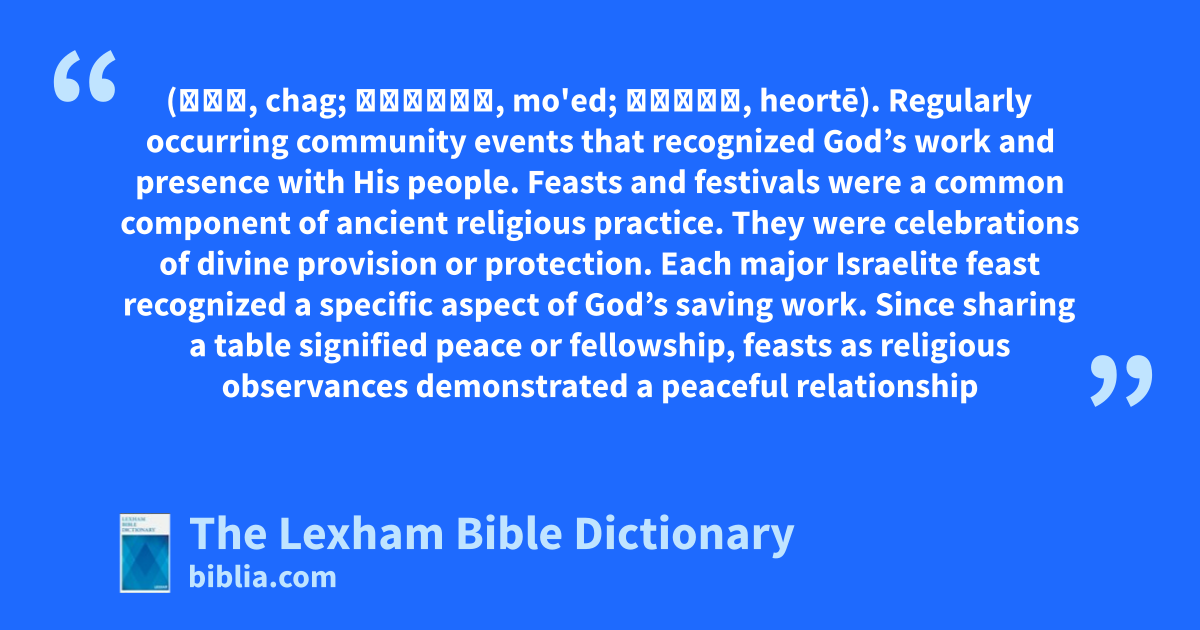 Feasts and Festivals of Israel (חַג, chag; מוֹעֵד, mo'ed; ἑορτή, heortē). Regularly occurring community events that recognized God’s work and presence with His people.