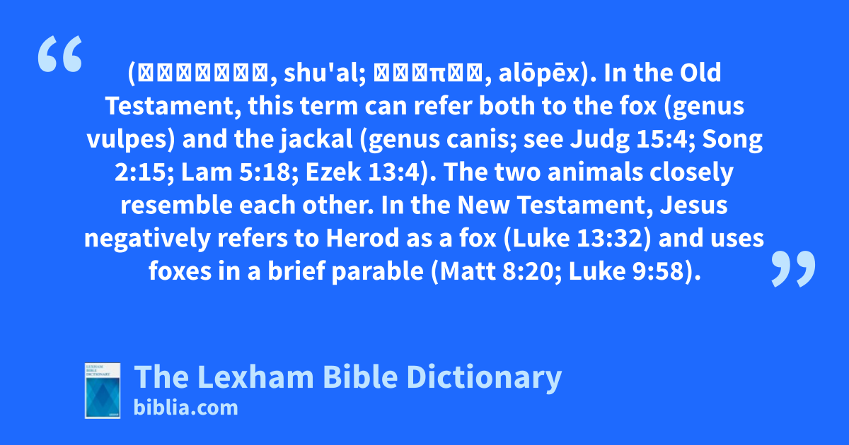 Fox (שׁוּעָל, shu'al; ἀλώπηξ, alōpēx). In the Old Testament, this term can refer both to the fox (genus vulpes) and the jackal (genus canis; see Judg 15:4; Song 2:15; Lam 5:18; Ezek 13:4). The two animals closely resemble each other. In the New Testament, Jesus negatively refers to Herod as a fox (Luke 13:32) and uses foxes in a brief parable (Matt 8:20; Luke 9:58).