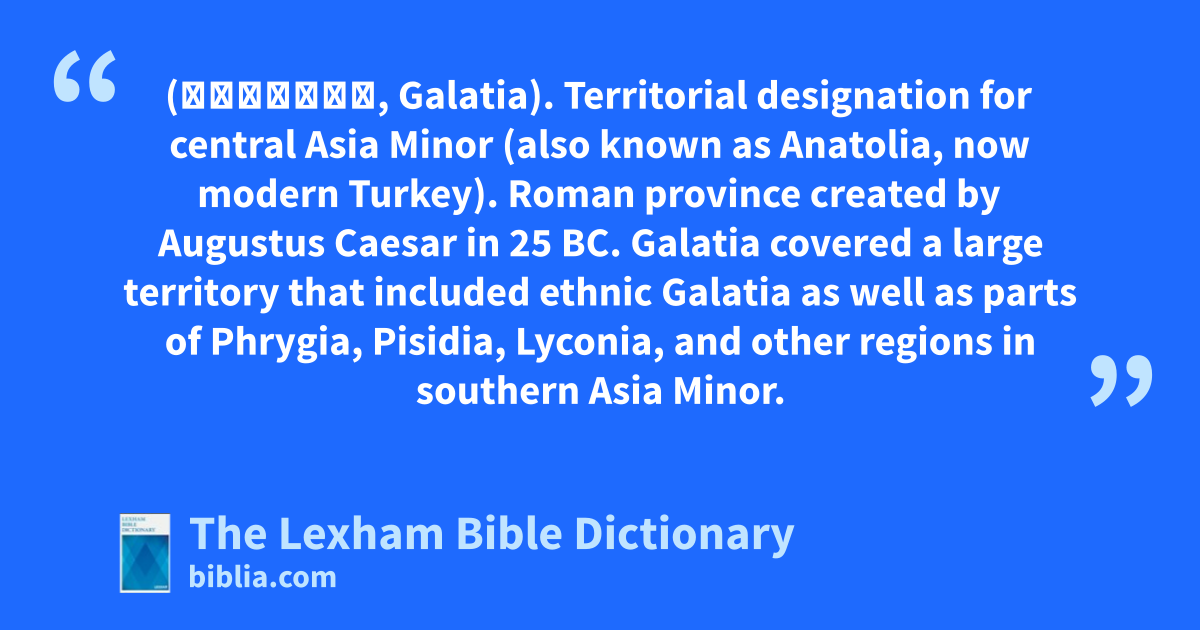 Galatia (Γαλατία, Galatia). Territorial designation for central Asia Minor (also known as Anatolia, now modern Turkey). Roman province created by Augustus Caesar in 25 bc. Galatia covered a large territory that included ethnic Galatia as well as parts of Phrygia, Pisidia, Lyconia, and other regions in southern Asia Minor.
