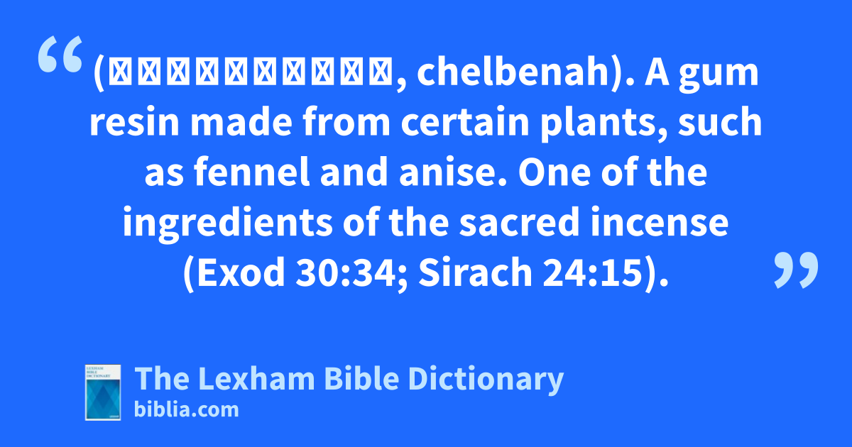 Galbanum (חֶלְבְּנָה, chelbenah). A gum resin made from certain plants, such as fennel and anise. One of the ingredients of the sacred incense (Exod 30:34; Sirach 24:15).
