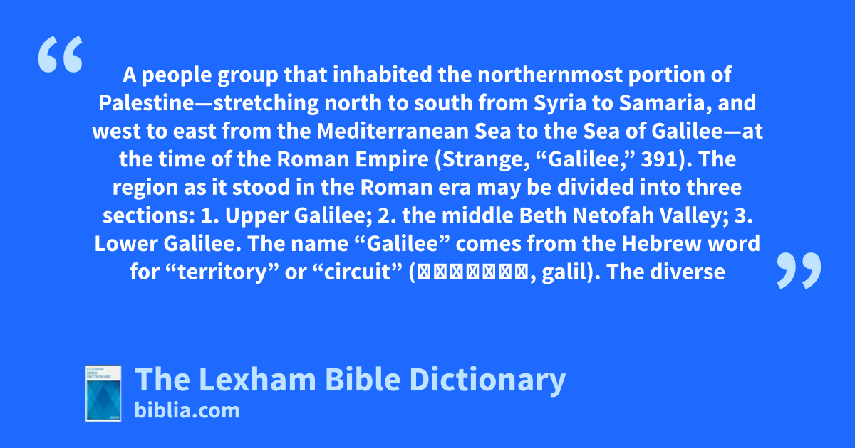 Galileans A people group that inhabited the northernmost portion of Palestine—stretching north to south from Syria to Samaria, and west to east from the Mediterranean Sea to the Sea of Galilee—at the time of the Roman Empire (Strange, “Galilee,” 391). The region as it stood in the Roman era may be divided into three sections: