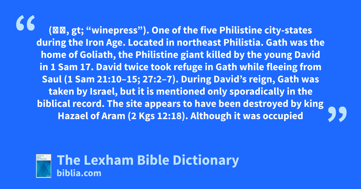Gath (גת, gt; “winepress”). One of the five Philistine city-states during the Iron Age. Located in northeast Philistia. Gath was the home of Goliath, the Philistine giant killed by the young David in 1 Sam 17. David twice took refuge in Gath while fleeing from Saul (1 Sam 21:10–15; 27:2–7). During David’s reign, Gath was taken by Israel, but it is mentioned only sporadically in the biblical record. The site appears to have been destroyed by king Hazael of Aram (2 Kgs 12:18). Although it was occupied subsequently, it never returned to its former status.