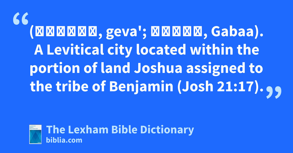 Geba (גֶּבַע, geva'; Γαβαα, Gabaa). A Levitical city located within the portion of land Joshua assigned to the tribe of Benjamin (Josh 21:17).