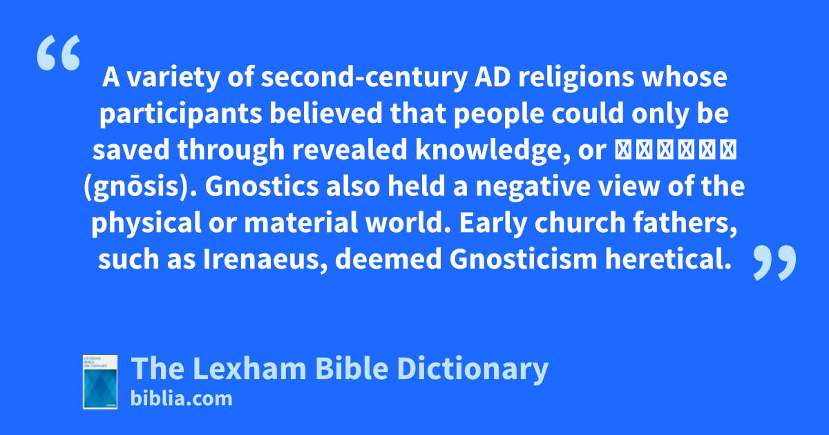 Gnosticism A variety of second-century ad religions whose participants believed that people could only be saved through revealed knowledge, or γνῶσις (gnōsis). Gnostics also held a negative view of the physical or material world. Early church fathers, such as Irenaeus, deemed Gnosticism heretical.