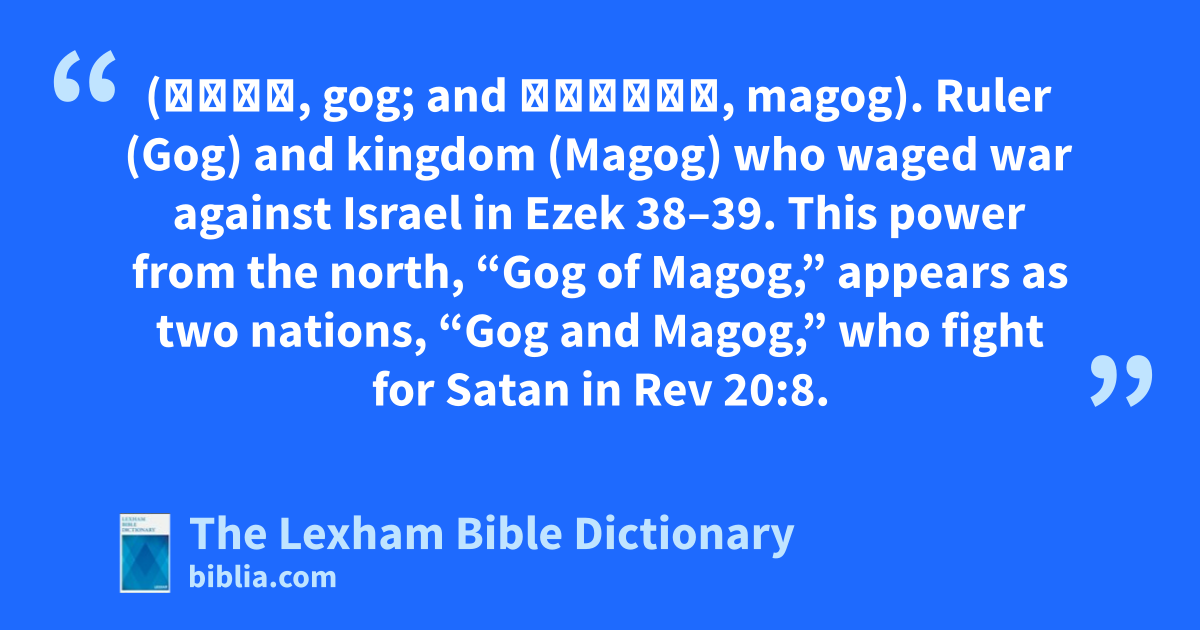Gog and Magog (גוֹג, gog; and מָגוֹג, magog). Ruler (Gog) and kingdom (Magog) who waged war against Israel in Ezek 38–39. This power from the north, “Gog of Magog,” appears as two nations, “Gog and Magog,” who fight for Satan in Rev 20:8.