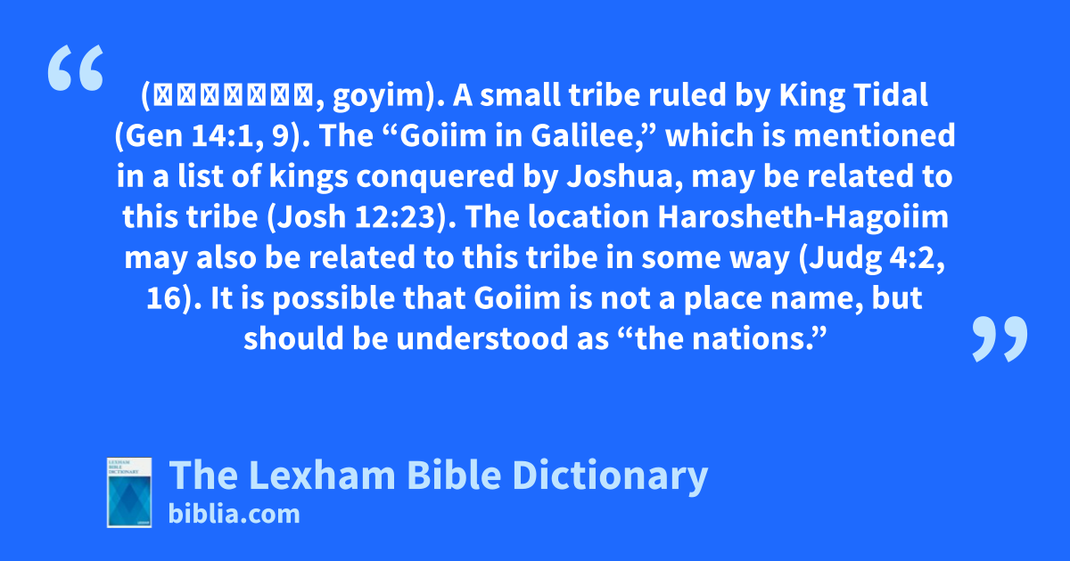Goiim (גּוֹיִם, goyim). A small tribe ruled by King Tidal (Gen 14:1, 9). The “Goiim in Galilee,” which is mentioned in a list of kings conquered by Joshua, may be related to this tribe (Josh 12:23). The location Harosheth-Hagoiim may also be related to this tribe in some way (Judg 4:2, 16). It is possible that Goiim is not a place name, but should be understood as “the nations.”