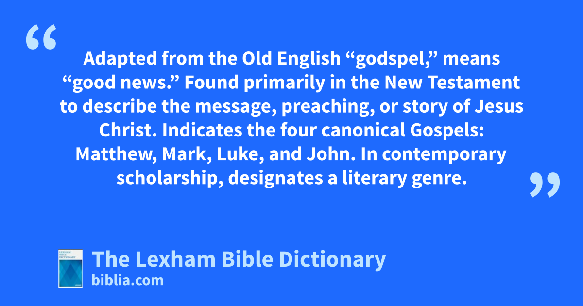 Gospel Genre Adapted from the Old English “godspel,” means “good news.” Found primarily in the New Testament to describe the message, preaching, or story of Jesus Christ. Indicates the four canonical Gospels: Matthew, Mark, Luke, and John. In contemporary scholarship, designates a literary genre.