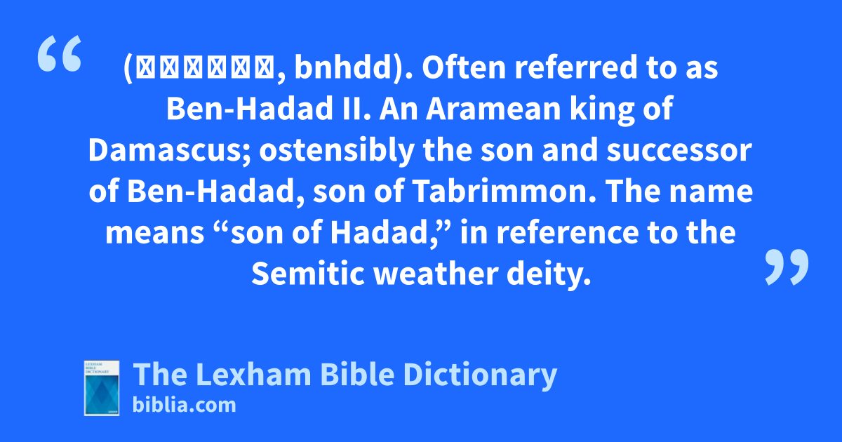 Ben-Hadad, Enemy of Ahab (בן־הדד, bnhdd). Often referred to as Ben-Hadad II. An Aramean king of Damascus; ostensibly the son and successor of Ben-Hadad, son of Tabrimmon. The name means “son of Hadad,” in reference to the Semitic weather deity.