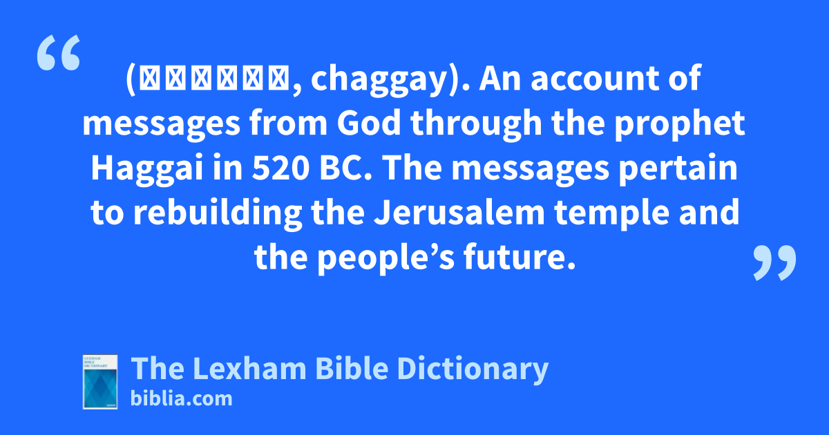 Haggai, Book Of (חַגַּי, chaggay). An account of messages from God through the prophet Haggai in 520 bc. The messages pertain to rebuilding the Jerusalem temple and the people’s future.