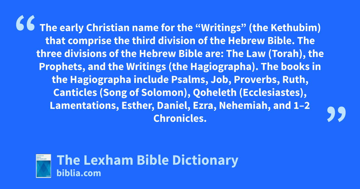 Hagiographa The early Christian name for the “Writings” (the Kethubim) that comprise the third division of the Hebrew Bible. The three divisions of the Hebrew Bible are: The Law (Torah), the Prophets, and the Writings (the Hagiographa). The books in the Hagiographa include Psalms, Job, Proverbs, Ruth, Canticles (Song of Solomon), Qoheleth (Ecclesiastes), Lamentations, Esther, Daniel, Ezra, Nehemiah, and 1–2 Chronicles.