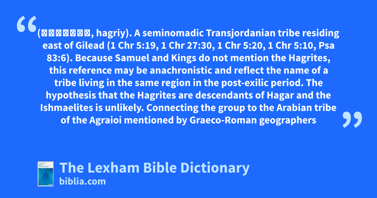 Hagrites (הַגְרִי, hagriy). A seminomadic Transjordanian tribe residing east of Gilead (1 Chr 5:19, 1 Chr 27:30, 1 Chr 5:20, 1 Chr 5:10, Psa 83:6). Because Samuel and Kings do not mention the Hagrites, this reference may be anachronistic and reflect the name of a tribe living in the same region in the post-exilic period. The hypothesis that the Hagrites are descendants of Hagar and the Ishmaelites is unlikely. Connecting the group to the Arabian tribe of the Agraioi mentioned by Graeco-Roman geographers is more plausible but still uncertain (see Strabo, Geography 16.4.2; Ptolemy, Geography 5.19.2).