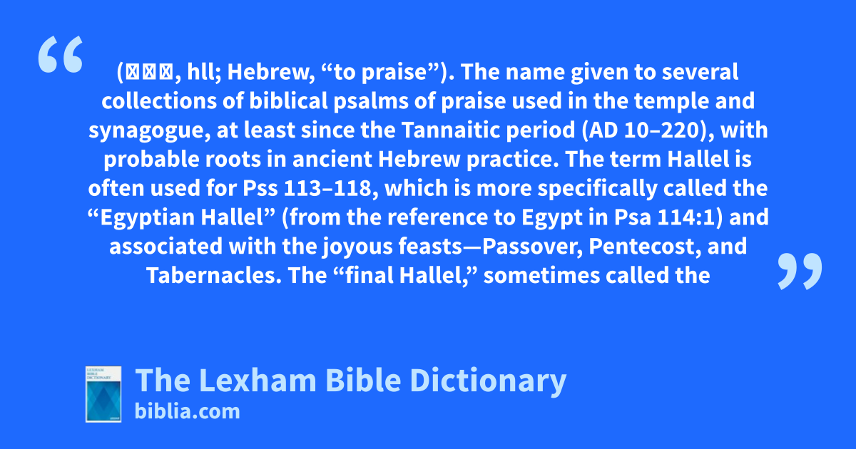 Hallel (הלל, hll; Hebrew, “to praise”). The name given to several collections of biblical psalms of praise used in the temple and synagogue, at least since the Tannaitic period (ad 10–220), with probable roots in ancient Hebrew practice.