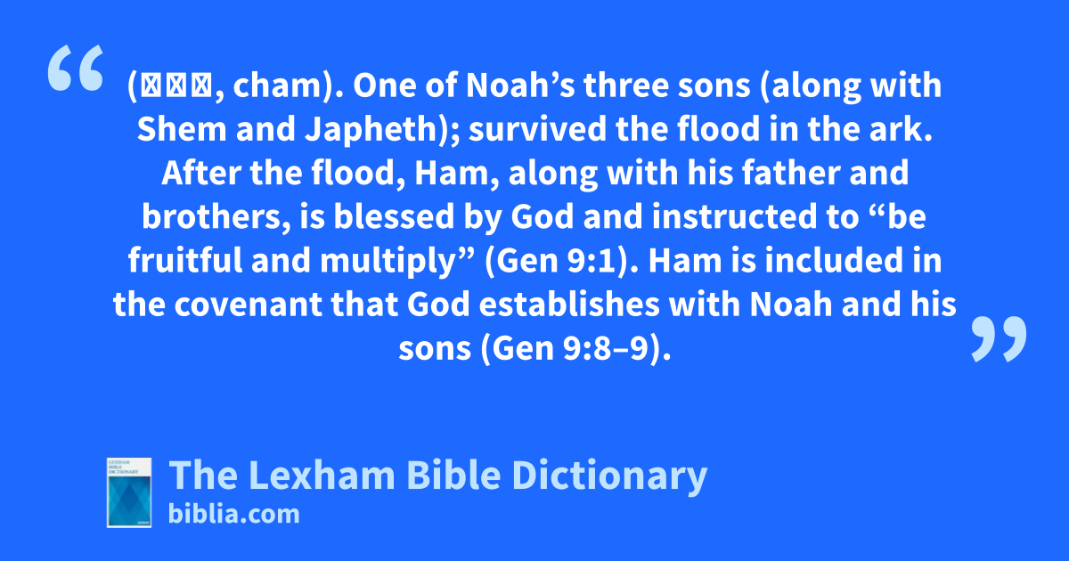 Ham, Son of Noah (חָם, cham). One of Noah’s three sons (along with Shem and Japheth); survived the flood in the ark. After the flood, Ham, along with his father and brothers, is blessed by God and instructed to “be fruitful and multiply” (Gen 9:1). Ham is included in the covenant that God establishes with Noah and his sons (Gen 9:8–9).