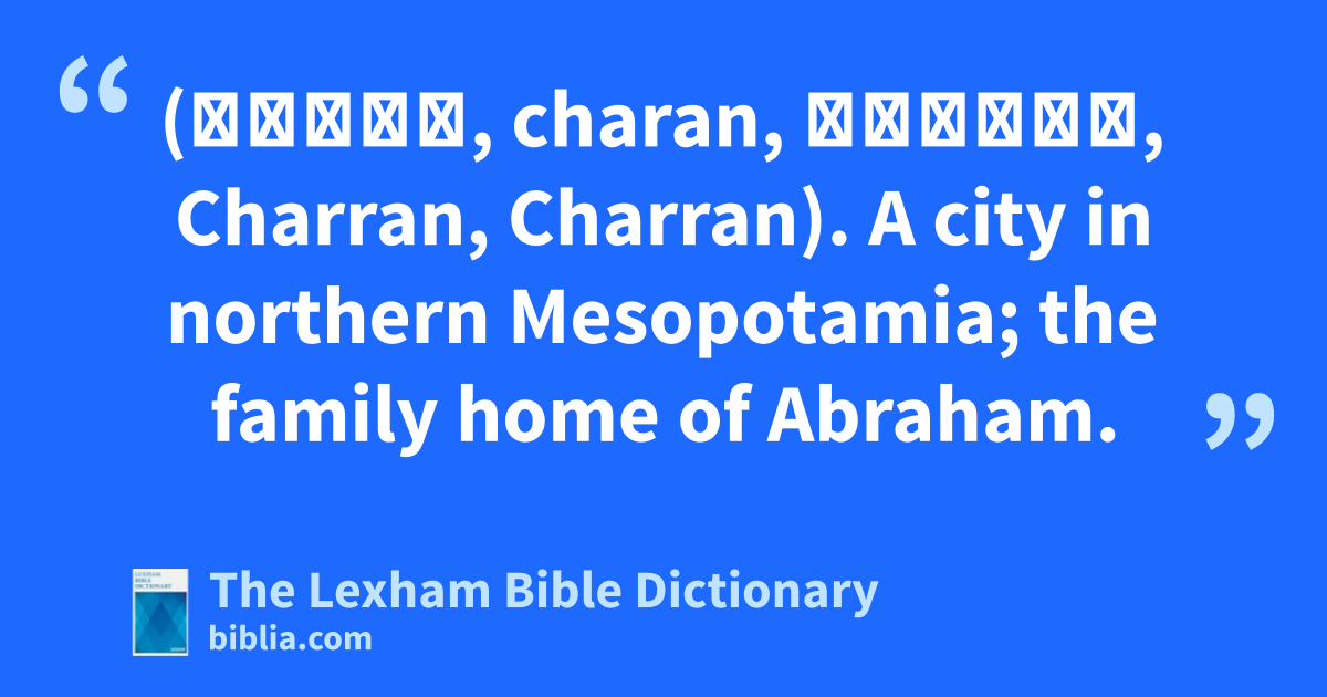 Haran (חָרָן, charan, Χαρράν, Charran, Charran). A city in northern Mesopotamia; the family home of Abraham.