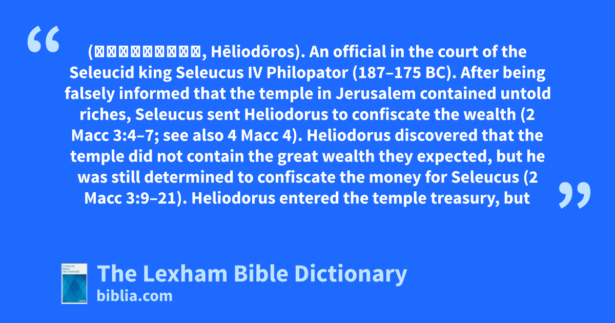 Heliodorus (Ἡλιόδωρος, Hēliodōros). An official in the court of the Seleucid king Seleucus IV Philopator (187–175 bc). After being falsely informed that the temple in Jerusalem contained untold riches, Seleucus sent Heliodorus to confiscate the wealth (2 Macc 3:4–7; see also 4 Macc 4). Heliodorus discovered that the temple did not contain the great wealth they expected, but he was still determined to confiscate the money for Seleucus (2 Macc 3:9–21). Heliodorus entered the temple treasury, but he was stopped by divine intervention—the appearance of a great horse carrying a fearsome rider with gold weapons, accompanied by two young men. Heliodorus was badly beaten by the horse and the young men (2 Macc 3:22–28). He recovered after the high priest, Onias, prayed for him; Heliodorus then returned to Syria without the money (2 Macc 3:29–40).
