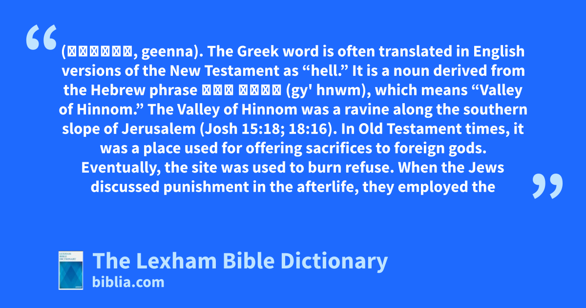 Hell (γέεννα, geenna). The Greek word is often translated in English versions of the New Testament as “hell.” It is a noun derived from the Hebrew phrase גיא הנום (gy' hnwm), which means “Valley of Hinnom.” The Valley of Hinnom was a ravine along the southern slope of Jerusalem (Josh 15:18; 18:16). In Old Testament times, it was a place used for offering sacrifices to foreign gods. Eventually, the site was used to burn refuse. When the Jews discussed punishment in the afterlife, they employed the image of this smoldering waste dump.