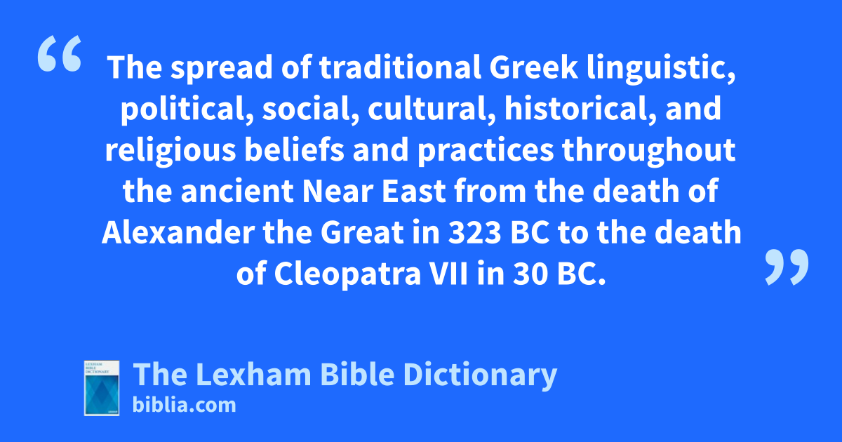 Hellenism The spread of traditional Greek linguistic, political, social, cultural, historical, and religious beliefs and practices throughout the ancient Near East from the death of Alexander the Great in 323 bc to the death of Cleopatra VII in 30 bc.