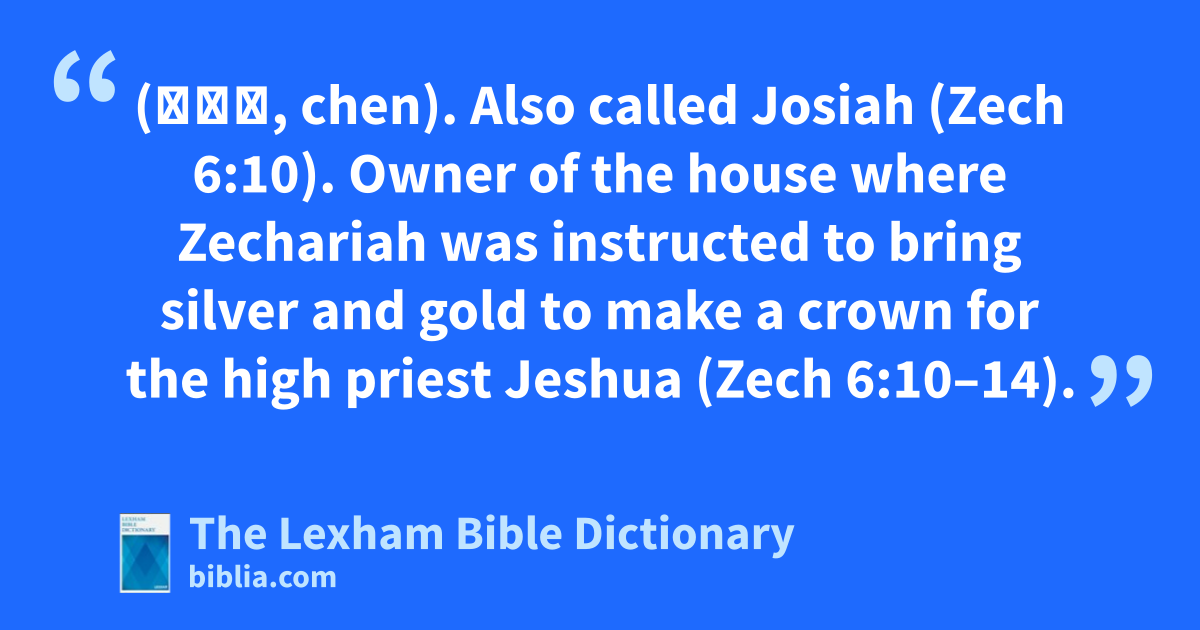 Hen, Son of Zephaniah (חֵן, chen). Also called Josiah (Zech 6:10). Owner of the house where Zechariah was instructed to bring silver and gold to make a crown for the high priest Jeshua (Zech 6:10–14).
