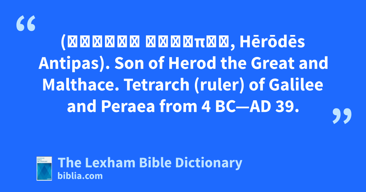 Herod Antipas (Ἡρῴδης Ἀντίπας, Hērōdēs Antipas). Son of Herod the Great and Malthace. Tetrarch (ruler) of Galilee and Peraea from 4 bc—ad 39.