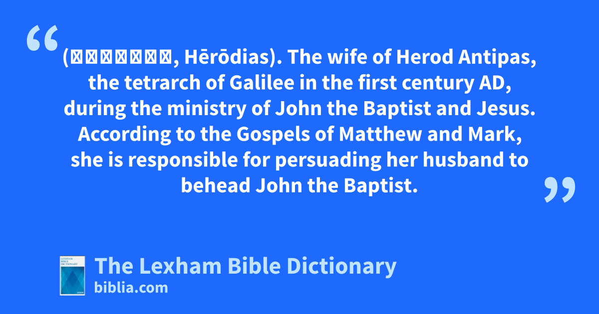 Herodias (Ἡρῳδιάς, Hērōdias). The wife of Herod Antipas, the tetrarch of Galilee in the first century ad, during the ministry of John the Baptist and Jesus. According to the Gospels of Matthew and Mark, she is responsible for persuading her husband to behead John the Baptist.
