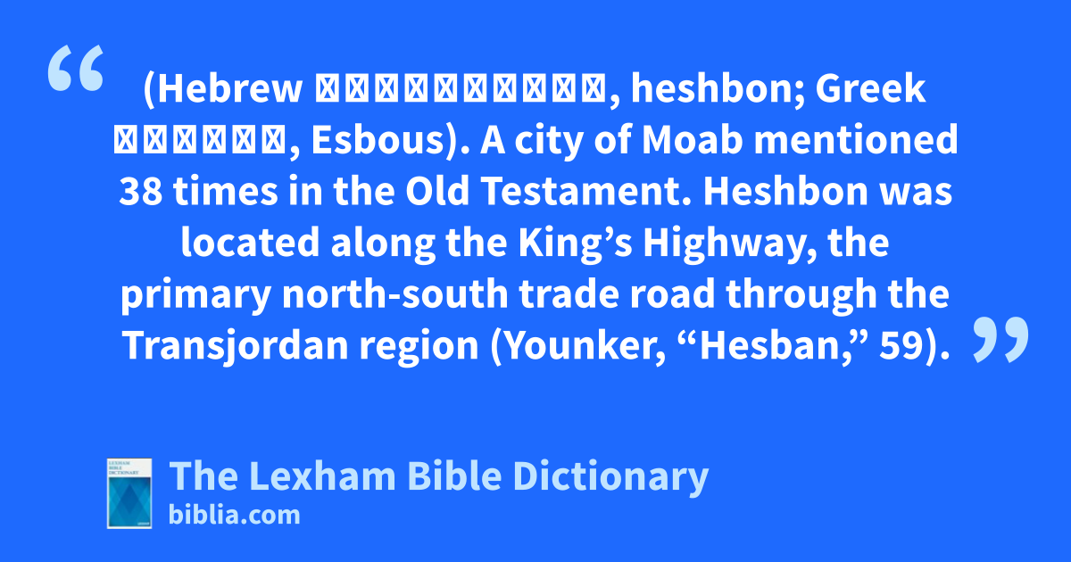 Heshbon (Hebrew הֶשְׁבּוֹן, heshbon; Greek Εσβους, Esbous). A city of Moab mentioned 38 times in the Old Testament. Heshbon was located along the King’s Highway, the primary north-south trade road through the Transjordan region (Younker, “Hesban,” 59).