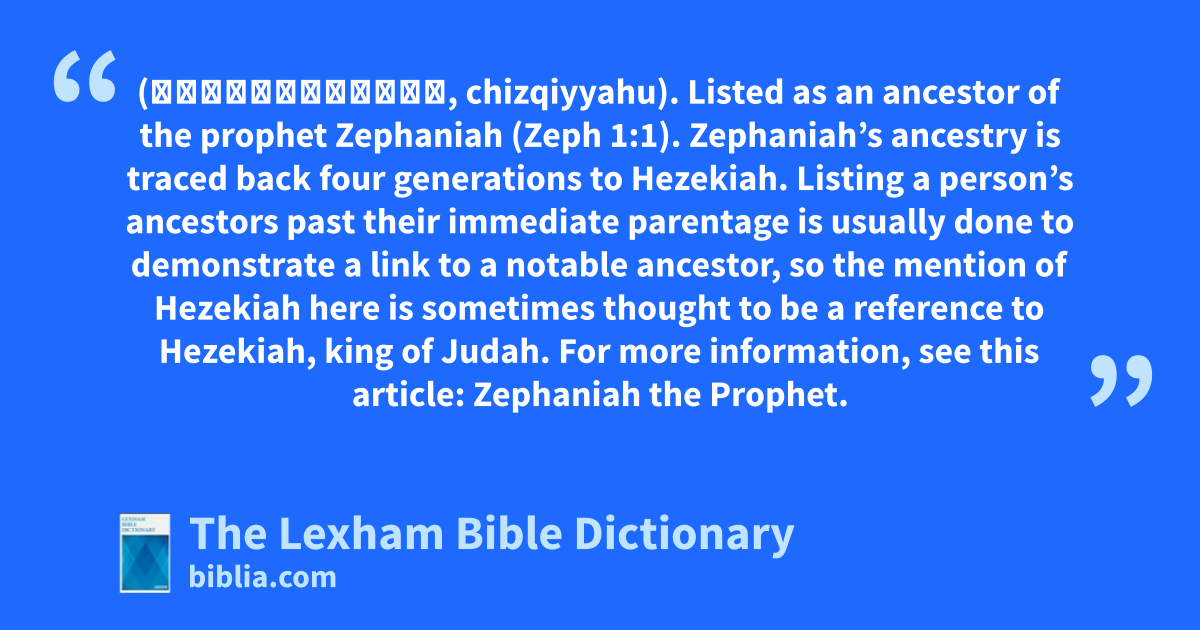 Hezekiah, Ancestor of Zephaniah (חִזְקִיָּהוּ, chizqiyyahu). Listed as an ancestor of the prophet Zephaniah (Zeph 1:1). Zephaniah’s ancestry is traced back four generations to Hezekiah. Listing a person’s ancestors past their immediate parentage is usually done to demonstrate a link to a notable ancestor, so the mention of Hezekiah here is sometimes thought to be a reference to Hezekiah, king of Judah. For more information, see this article: Zephaniah the Prophet.