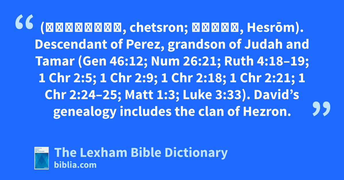 Hezron, Son of Perez (חֶצְרוֹן, chetsron; Ἑσρώμ, Hesrōm). Descendant of Perez, grandson of Judah and Tamar (Gen 46:12; Num 26:21; Ruth 4:18–19; 1 Chr 2:5; 1 Chr 2:9; 1 Chr 2:18; 1 Chr 2:21; 1 Chr 2:24–25; Matt 1:3; Luke 3:33). David’s genealogy includes the clan of Hezron.