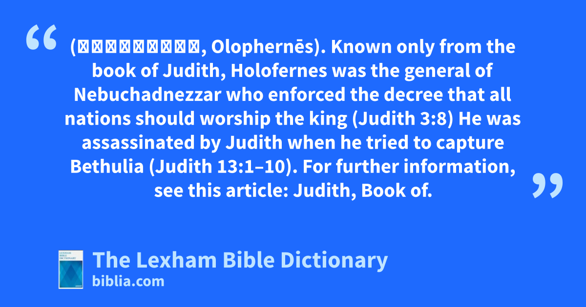 Holofernes (Ὀλοφέρνης, Olophernēs). Known only from the book of Judith, Holofernes was the general of Nebuchadnezzar who enforced the decree that all nations should worship the king (Judith 3:8) He was assassinated by Judith when he tried to capture Bethulia (Judith 13:1–10). For further information, see this article: Judith, Book of.