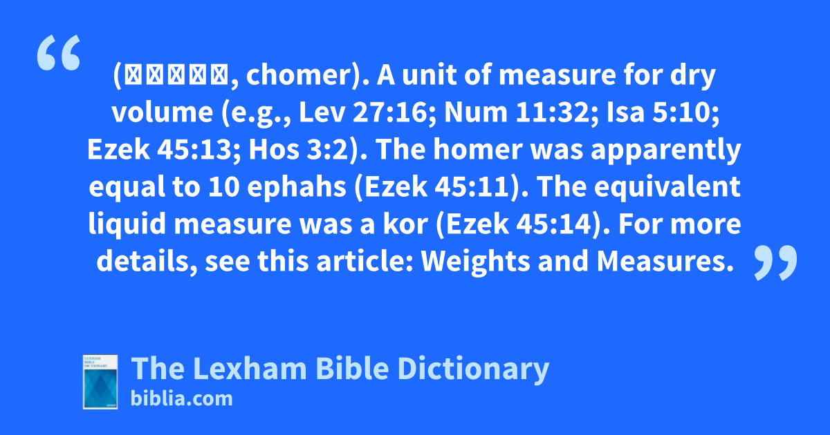 Homer (חֹמֶר, chomer). A unit of measure for dry volume (e.g., Lev 27:16; Num 11:32; Isa 5:10; Ezek 45:13; Hos 3:2). The homer was apparently equal to 10 ephahs (Ezek 45:11). The equivalent liquid measure was a kor (Ezek 45:14). For more details, see this article: Weights and Measures.