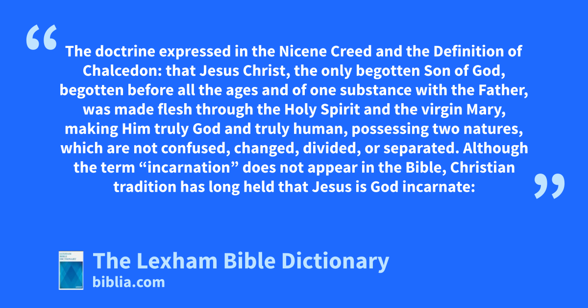 Incarnation The doctrine expressed in the Nicene Creed and the Definition of Chalcedon: that Jesus Christ, the only begotten Son of God, begotten before all the ages and of one substance with the Father, was made flesh through the Holy Spirit and the virgin Mary, making Him truly God and truly human, possessing two natures, which are not confused, changed, divided, or separated.